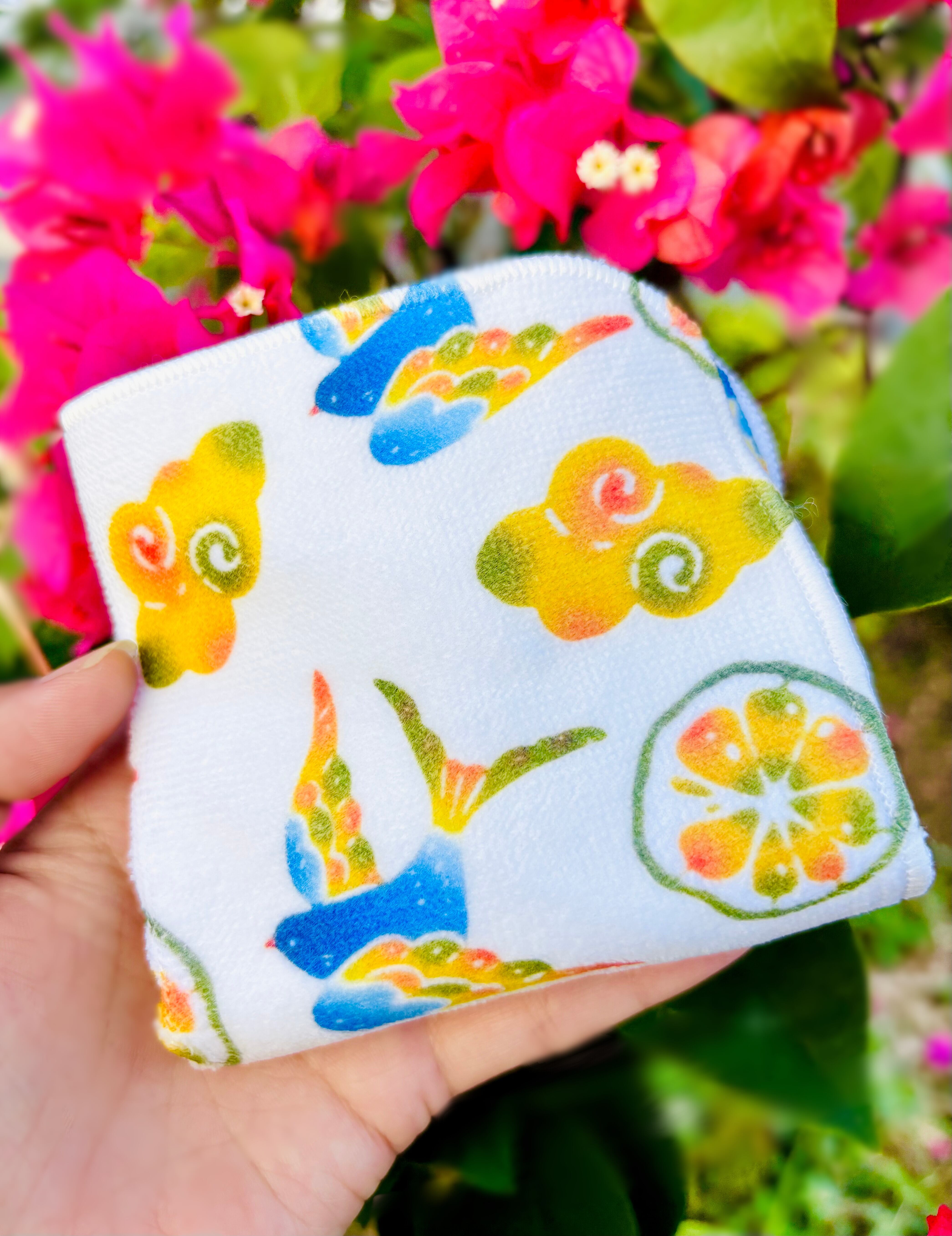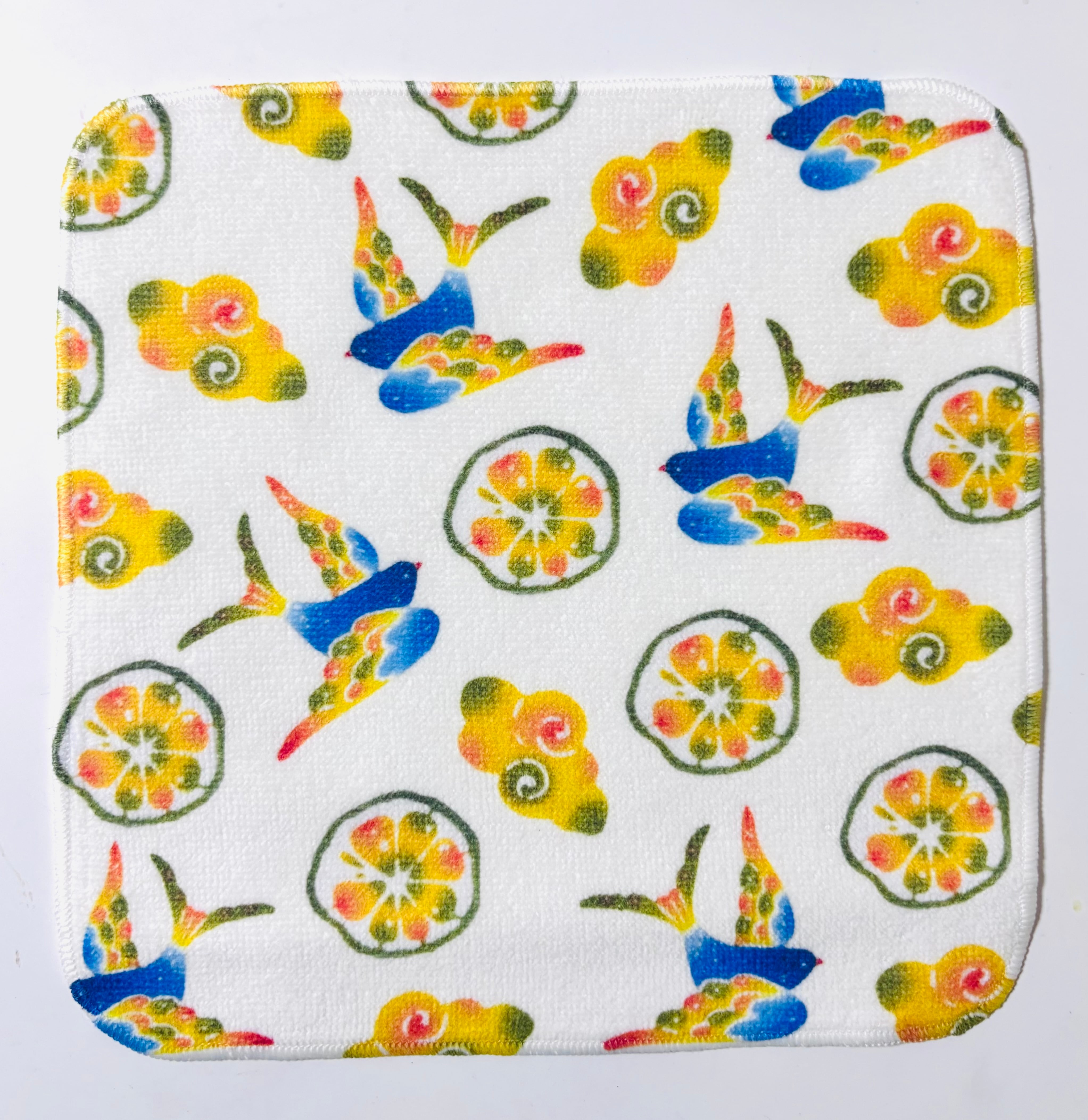 2025年11月1日より日本トランスオーシャン航空JTA機内ヘッドレスカバーに採用された紅型デザイン「楽園へ飛んだ日」をミニハンカチタオルにしました。
