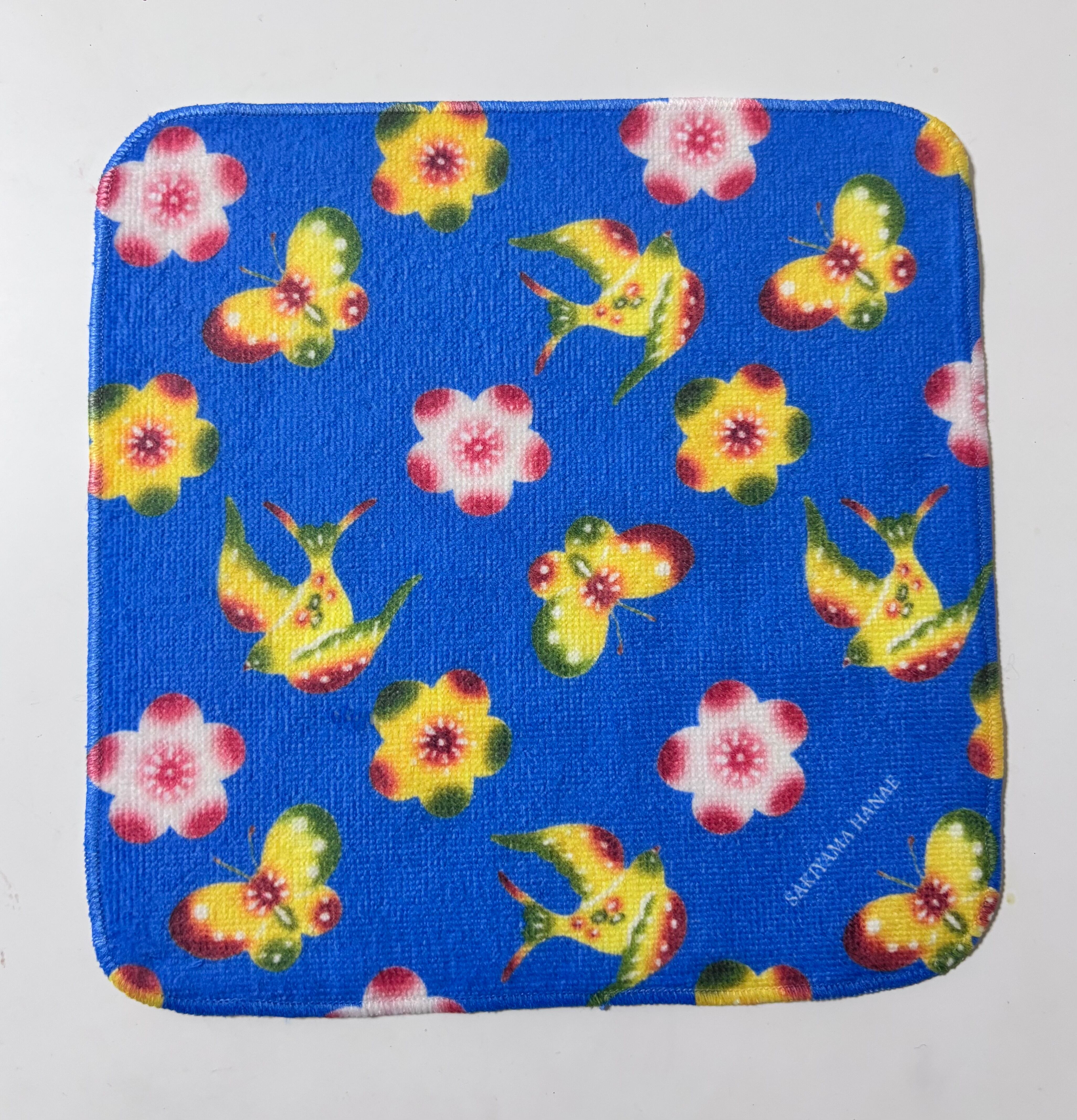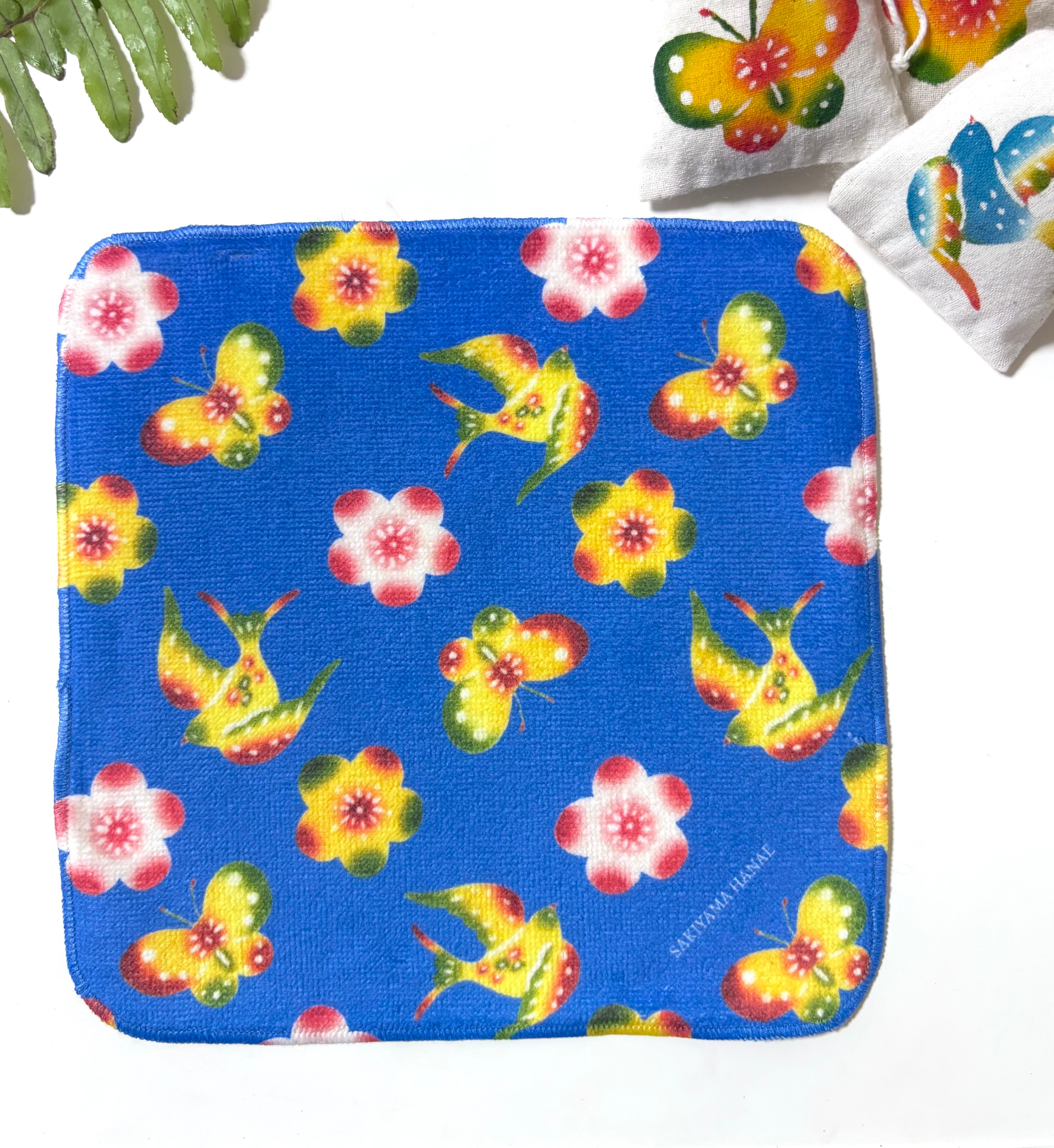 琉球紅型の図柄、鳥蝶梅模様を可愛くアレンジした原画を、プリントのミニハンカチタオルにしました。縁起柄です!