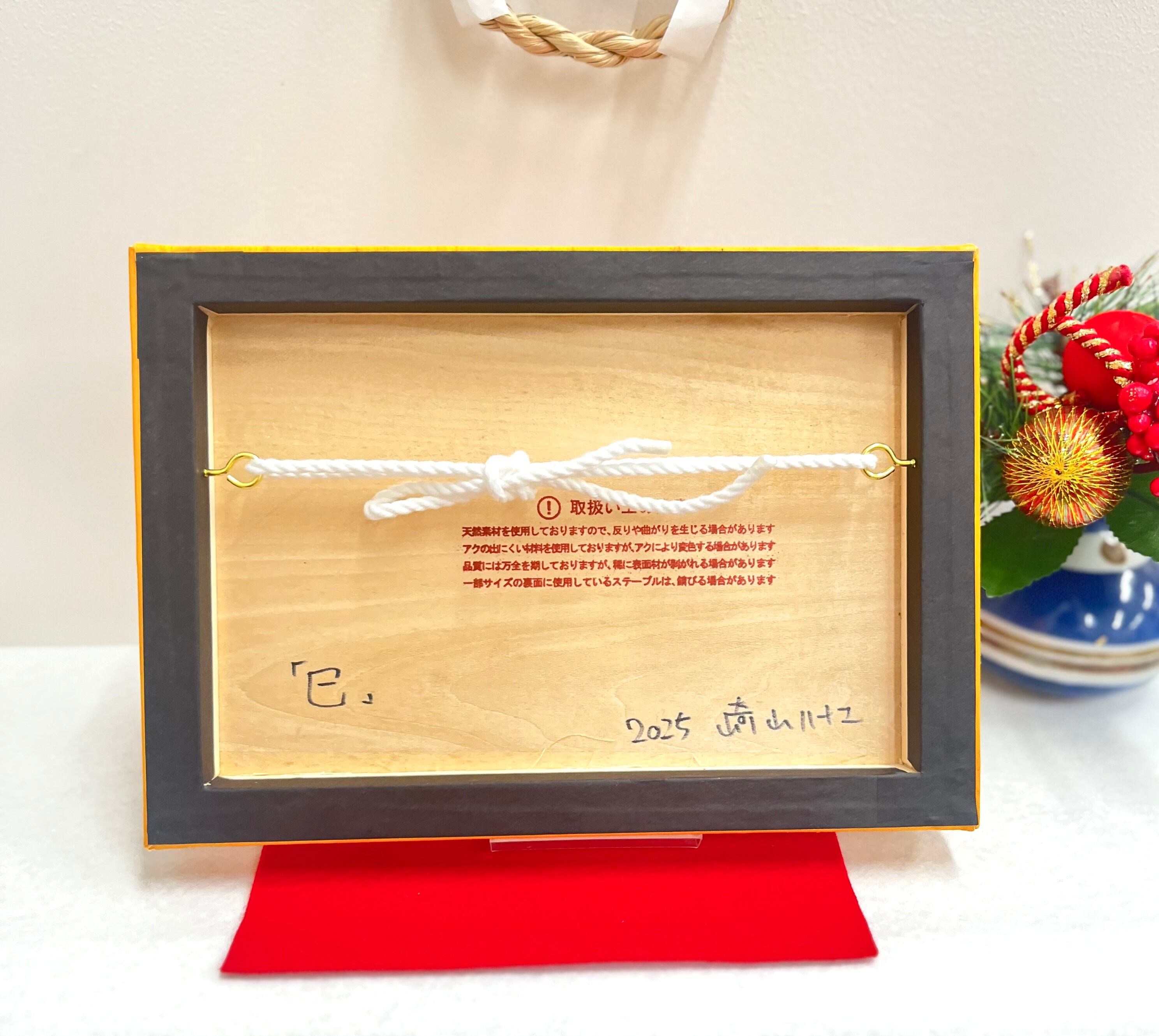 こちらは紅型技法で今年の干支《巳》を染めて、ファブリックパネルにしました。